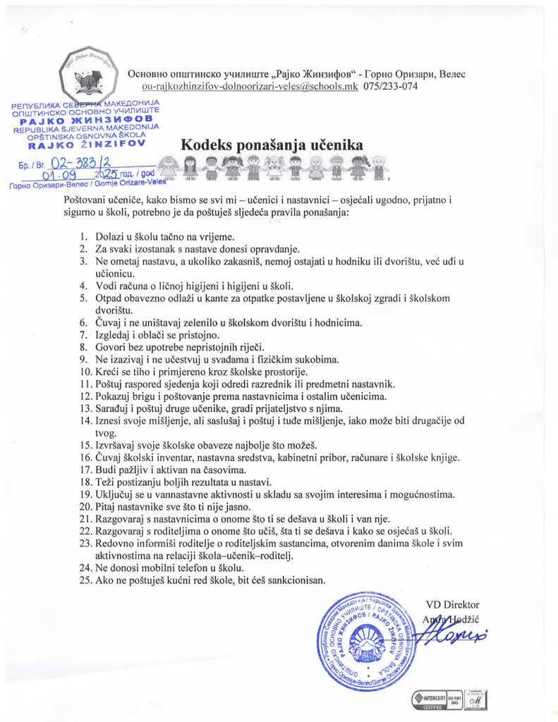 Кодексот на однесување на учениците ги утврдува правилата, обврските и одговорностите кои учениците треба да ги почитуваат за време на воспитно-образовниот процес. Тој промовира меѓусебна почит, дисциплина, толеранција и одговорно однесување, со цел создавање безбедна, позитивна и поттикнувачка училишна средина за учење и развој.