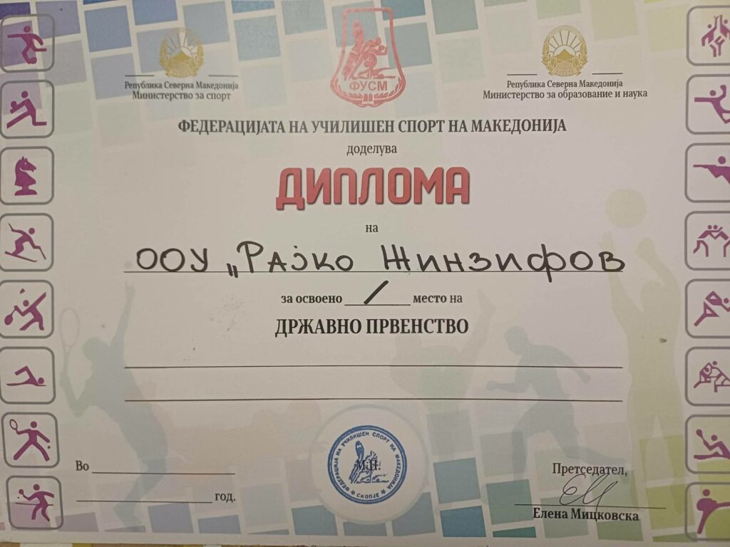 Во организација на Федерација на училишен спорт вчера во Пехчево се одржа државно првенство во ПИНГ-ПОНГ за основни и средни училишта во машка и женска конкуренција. Од нашето училиште земаа учество учениците Давуд Мемиќ од 9 одд. и Дарис Мемиќ од 6 одд.. Давуд се пласира меѓу 16 најдобри во државата а Дарис стаса до полуфинале.