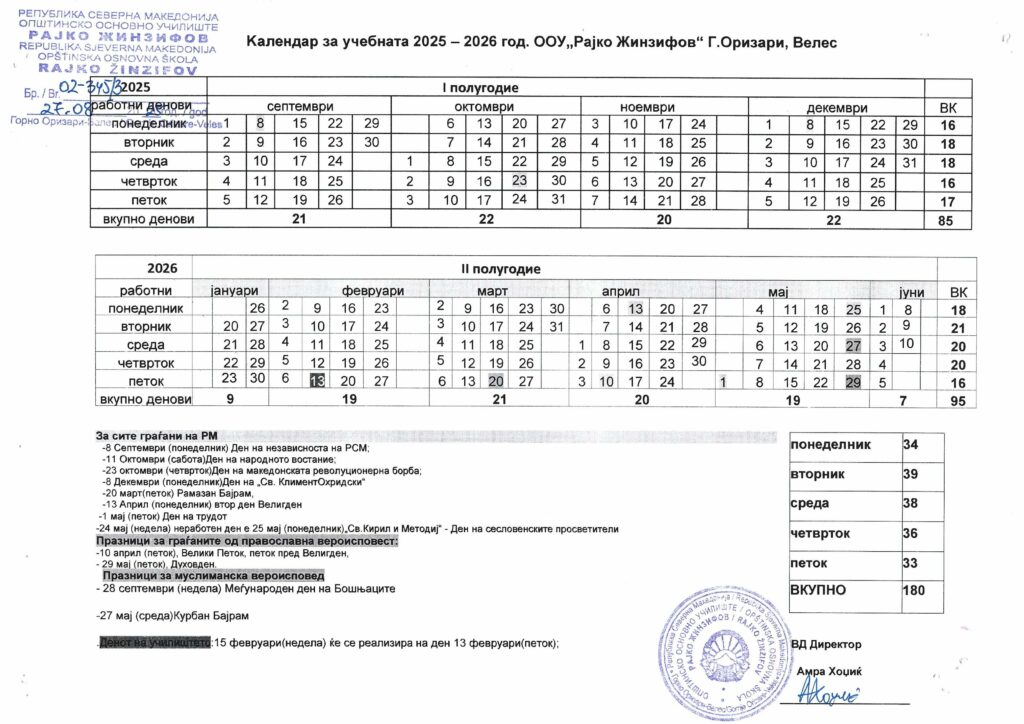 Овој календар ги содржи најважните датуми, настани и активности планирани за учебната 2025/2026 година. Тој служи како информативен водич за учениците, родителите и вработените во училиштето, со цел навремено планирање, координација и успешно реализирање на наставните и воннаставните активности во текот на учебната година.
