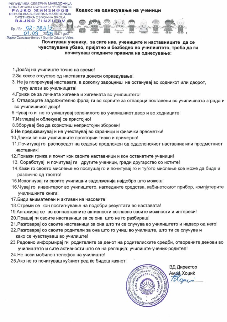Кодексот на однесување на учениците ги утврдува правилата, обврските и одговорностите кои учениците треба да ги почитуваат за време на воспитно-образовниот процес. Тој промовира меѓусебна почит, дисциплина, толеранција и одговорно однесување, со цел создавање безбедна, позитивна и поттикнувачка училишна средина за учење и развој.