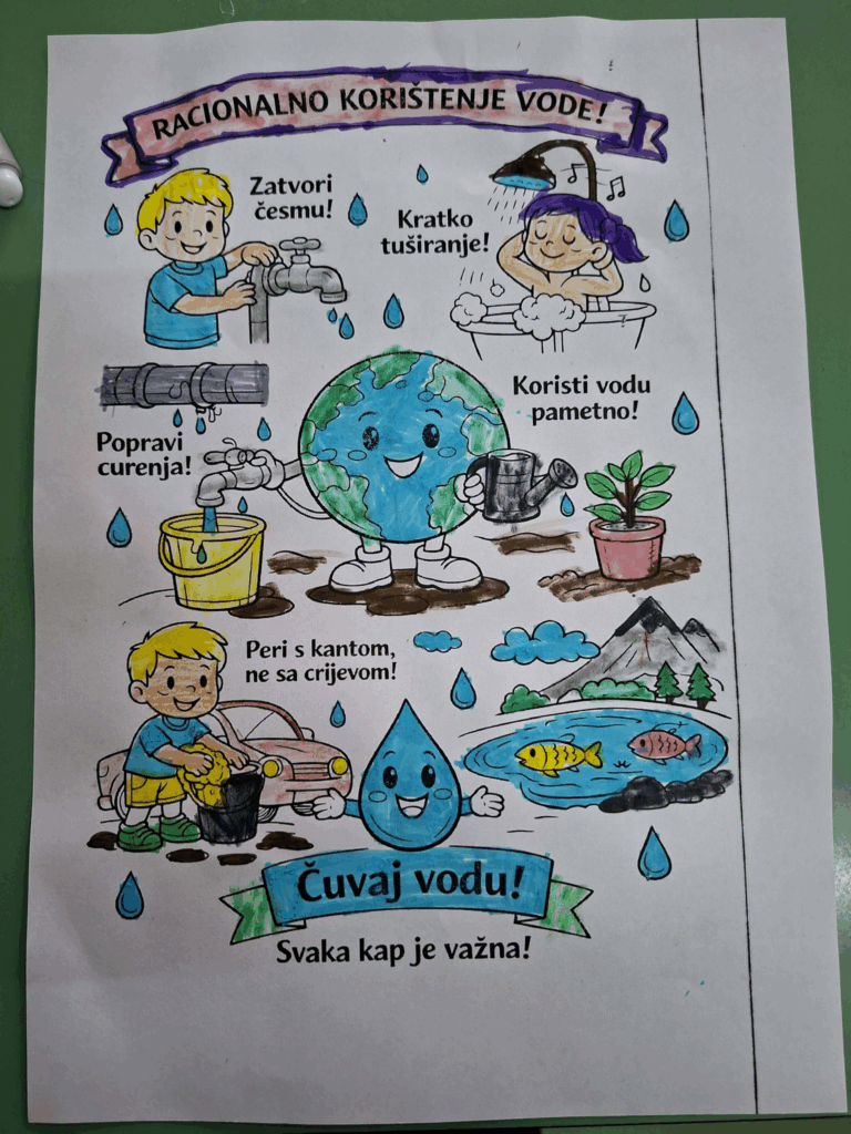 По повод 22 март кога го прославуваме Светскиот ден на водите, учениците од V одд. со наставничките Ана Јанушева и Анита Коцевска проследија презентација за важноста на водата и изработија цртежи со пораки за тоа како да го заштитиме овој скапоцен извор и изработија капки вода од балони.