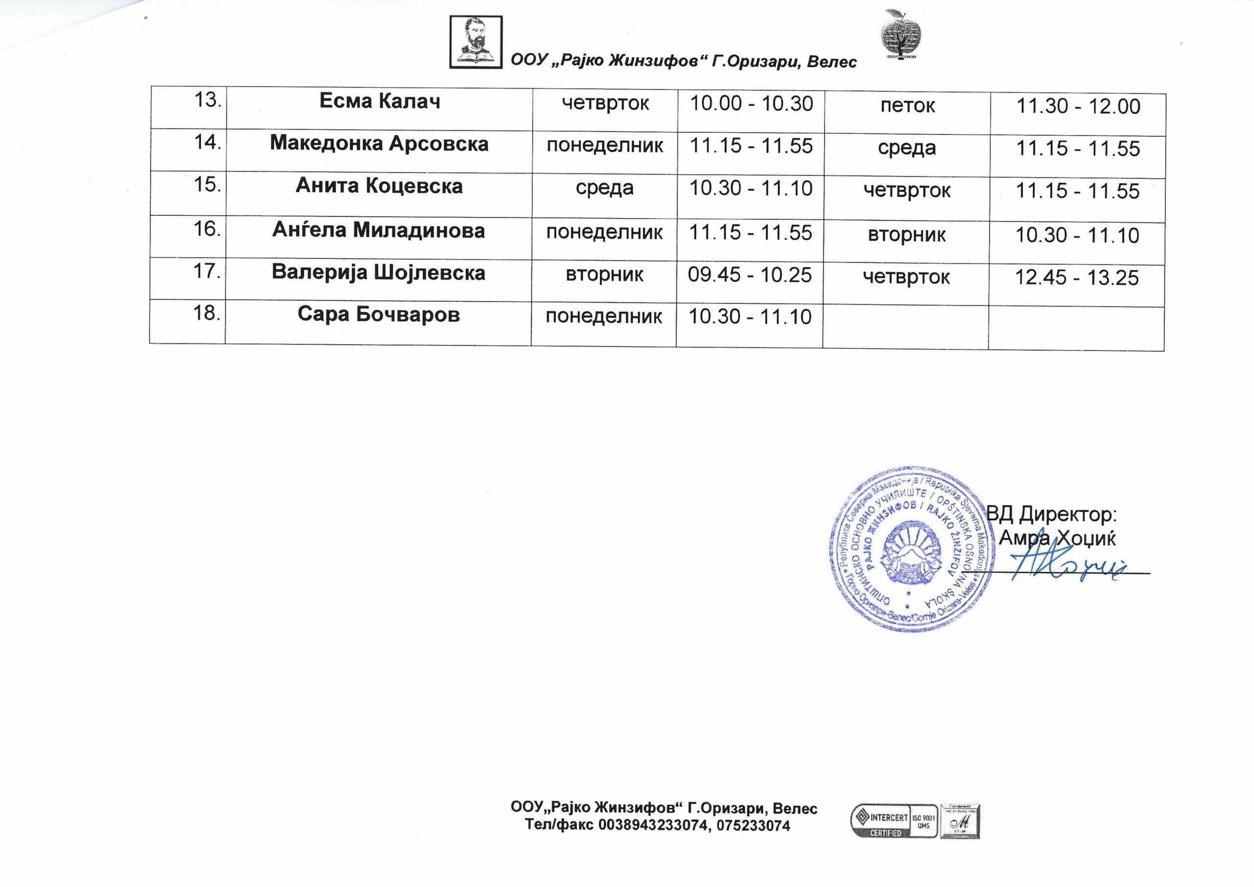 Приемните денови се организирани по однапред определен распоред за секој наставник. Во прилог погледнете го распоредот.