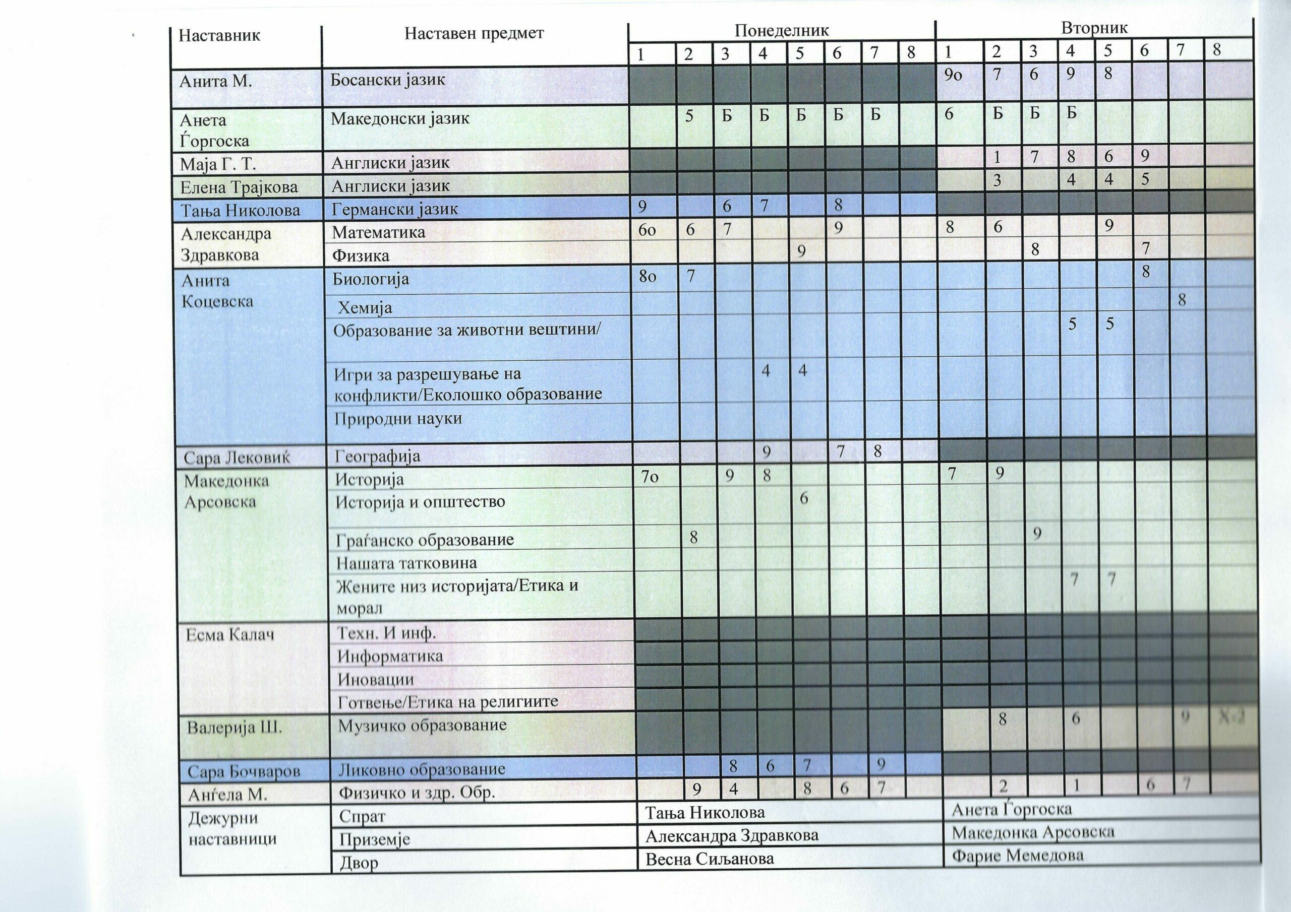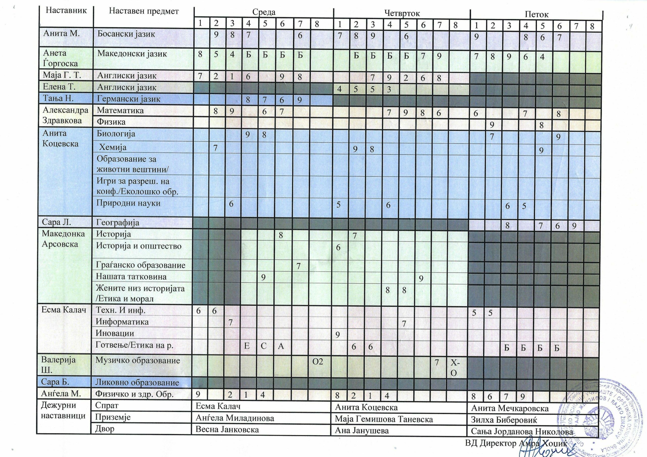 Распоредот на часови овозможува рамномерна распределба на наставните предмети, соодветна динамика на учење и континуирана поддршка за учениците во сите одделенија.